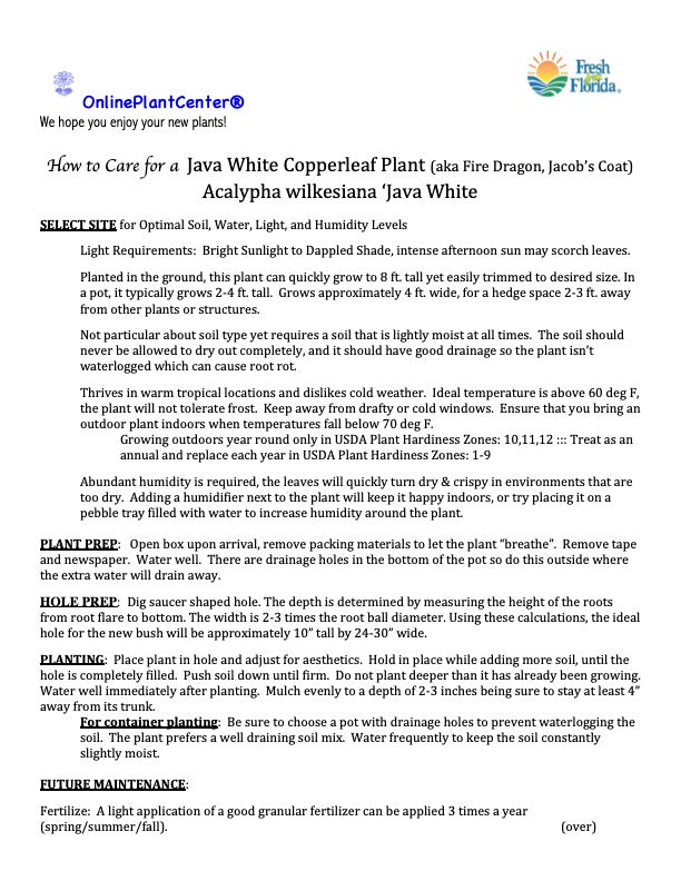 - Full sun to partial shade for best leaf color, intense afternoon sun can scorch leaves