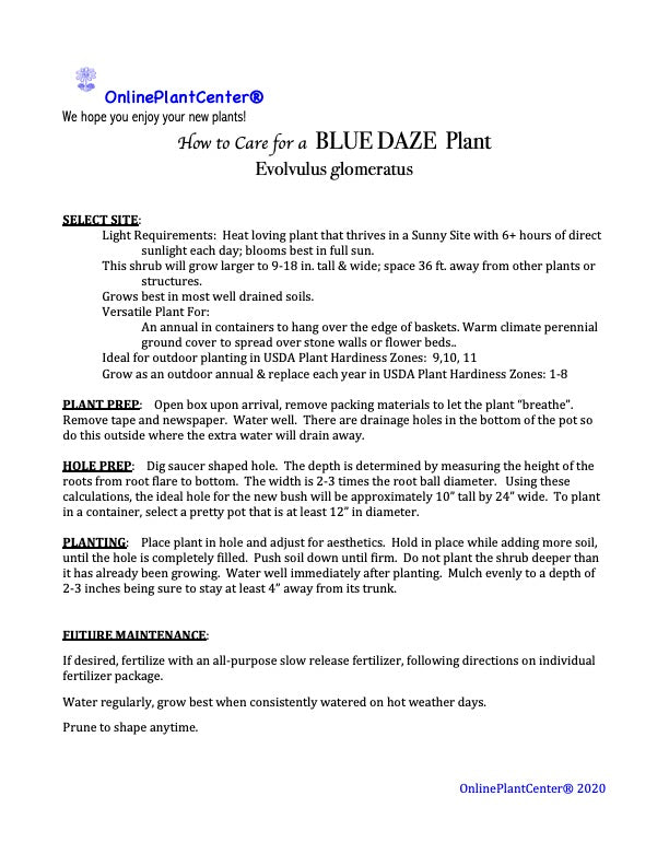 The eye catching, brilliantly hued, true blue flowers of this sun loving plant create a striking accent in the landscape. Plant en masse for even greater effect. Blooms summer to fall atop silvery green leaves. Perfect for a cascading hangs over the edge patio planter or window box. An herbaceous outdoor perennial for USDA Zones 9 to 11 only, grow as an annual in all other Zones and replace each-year. Drought tolerant, thriving in garden hot spots that threaten less sun tolerant plants. Grows 9 in. to 18 in. tall x 36 in. W, gradually forming a non aggressive, sprawling mound. Use as a border plant, ground cover, in hanging baskets or as a spiller in mixed containers.
